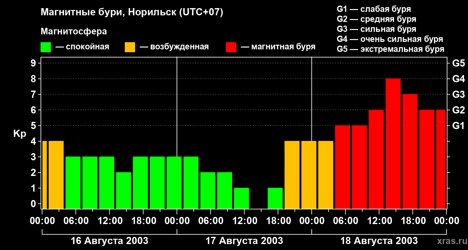 Изменения геомагнитного индекса Kp с 16 по 18 августа 2003 года для средних широт