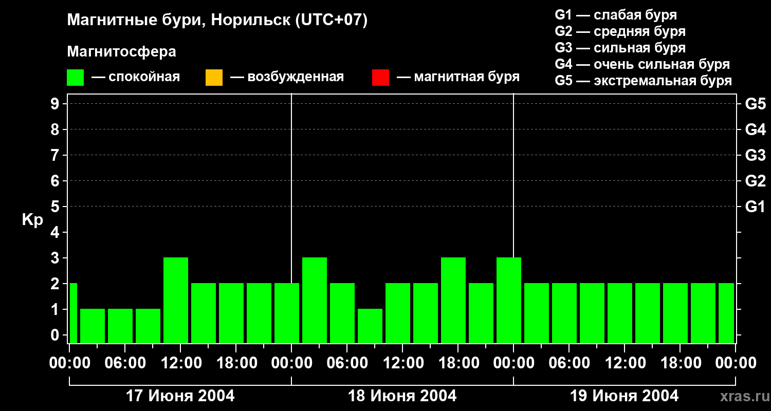 Изменения геомагнитного индекса Kp с 17 по 19 июня 2004 года для средних широт