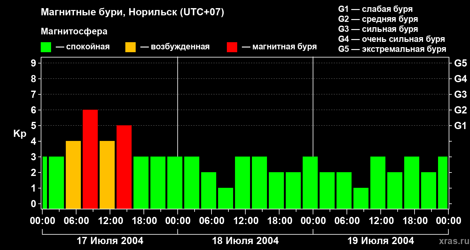 Изменения геомагнитного индекса Kp с 17 по 19 июля 2004 года для средних широт