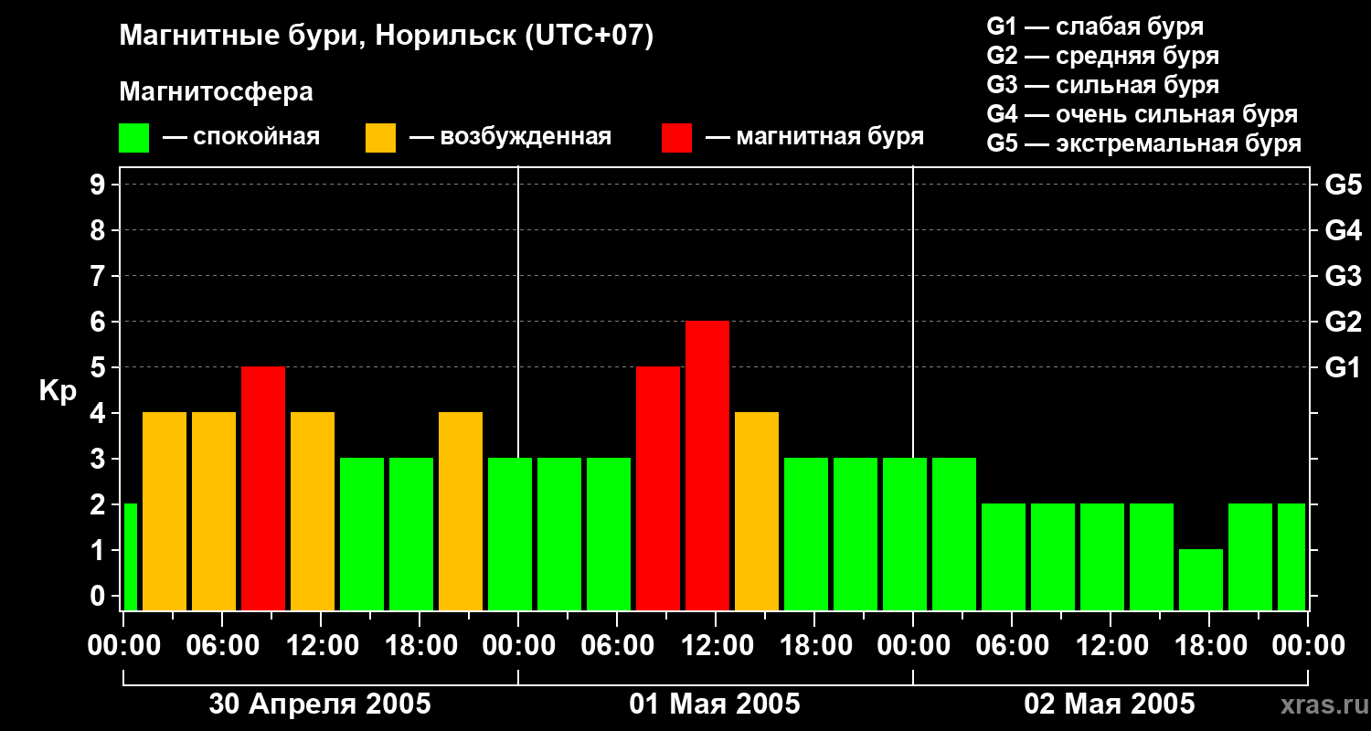 Изменения геомагнитного индекса Kp с 30 апреля по 2 мая 2005 года для средних широт