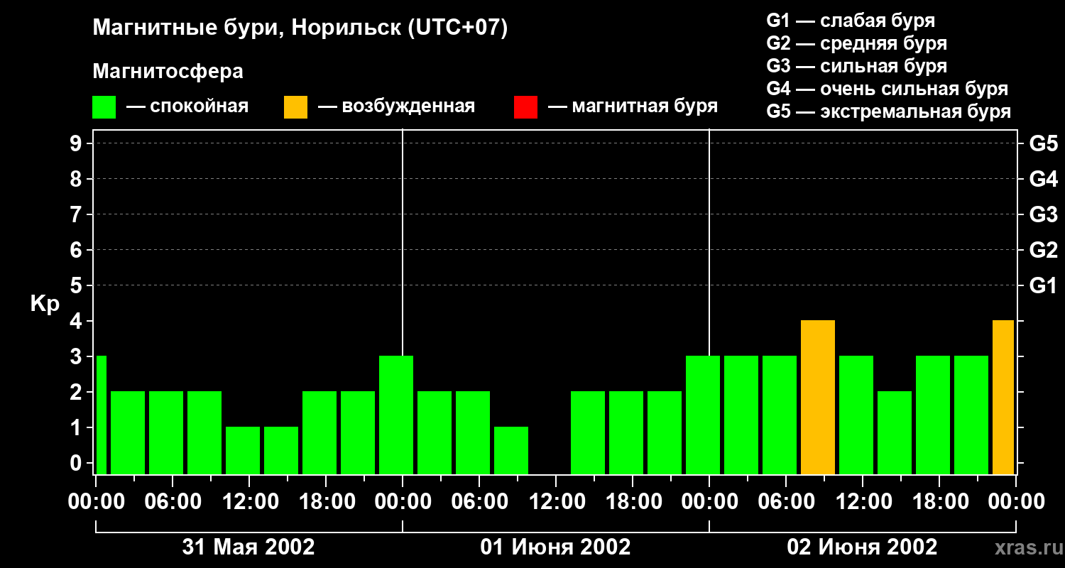 Изменения геомагнитного индекса Kp с 31 мая по 2 июня 2002 года для средних широт
