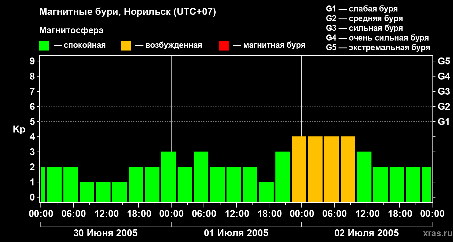 Изменения геомагнитного индекса Kp с 30 июня по 2 июля 2005 года для средних широт