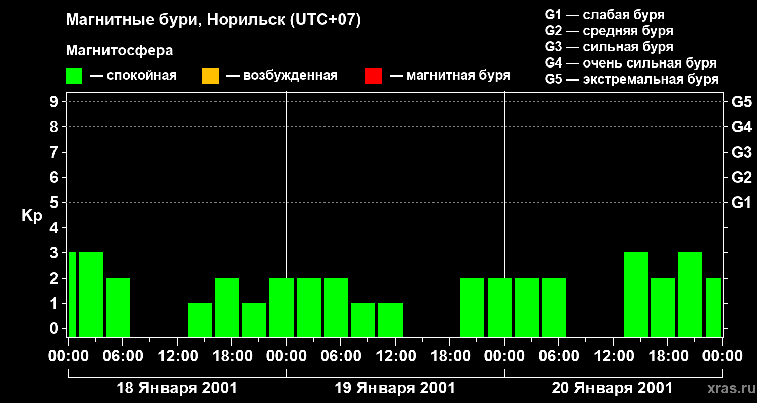 Изменения геомагнитного индекса Kp с 18 по 20 января 2001 года для средних широт