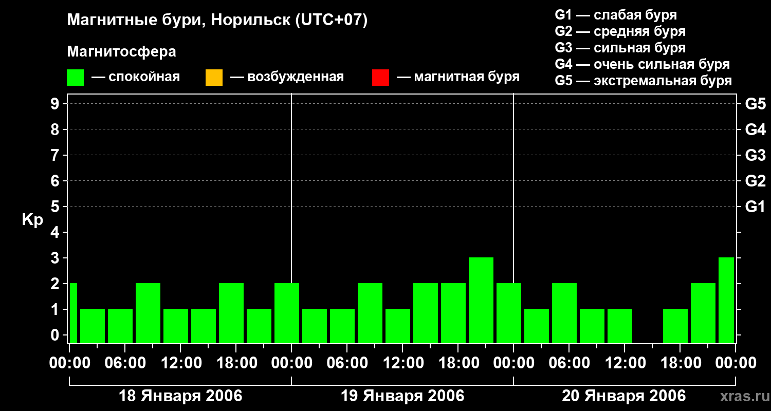 Изменения геомагнитного индекса Kp с 18 по 20 января 2006 года для средних широт