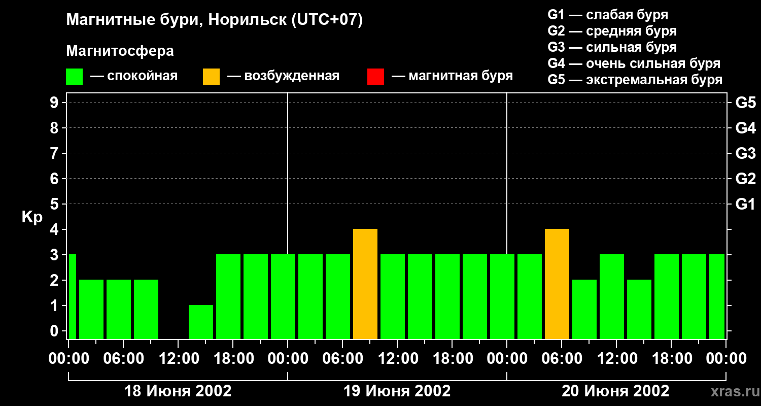Изменения геомагнитного индекса Kp с 18 по 20 июня 2002 года для средних широт