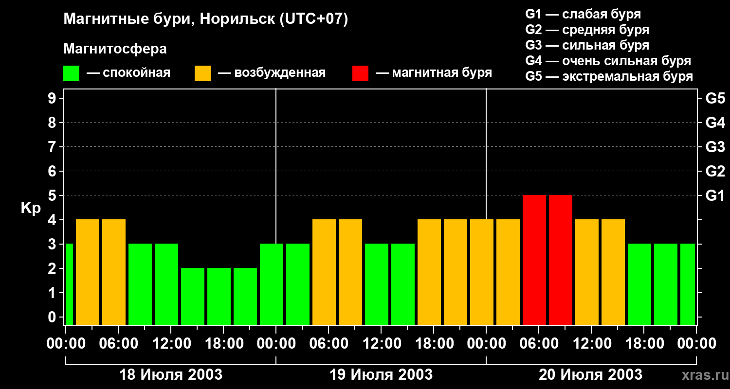 Изменения геомагнитного индекса Kp с 18 по 20 июля 2003 года для средних широт