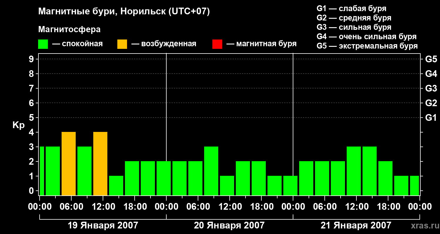 Изменения геомагнитного индекса Kp с 19 по 21 января 2007 года для средних широт
