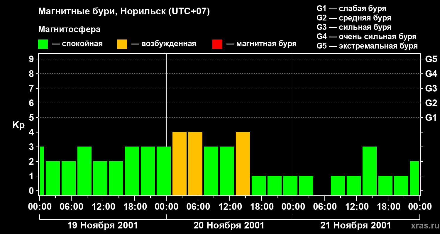 Изменения геомагнитного индекса Kp с 19 по 21 ноября 2001 года для средних широт