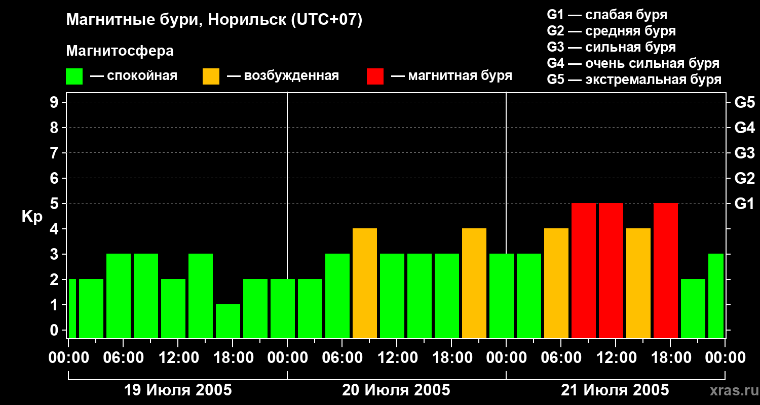 Изменения геомагнитного индекса Kp с 19 по 21 июля 2005 года для средних широт