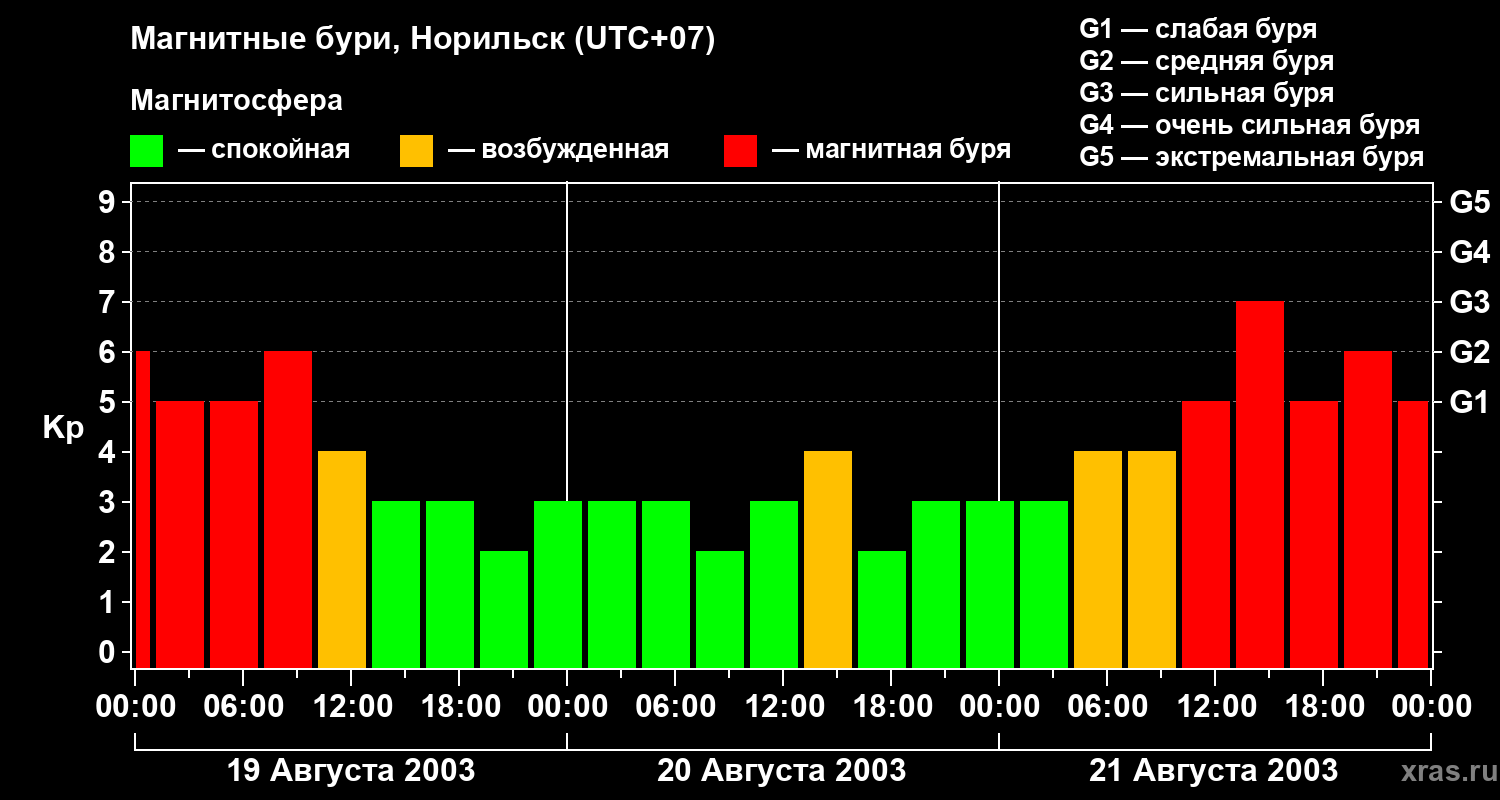 Изменения геомагнитного индекса Kp с 19 по 21 августа 2003 года для средних широт