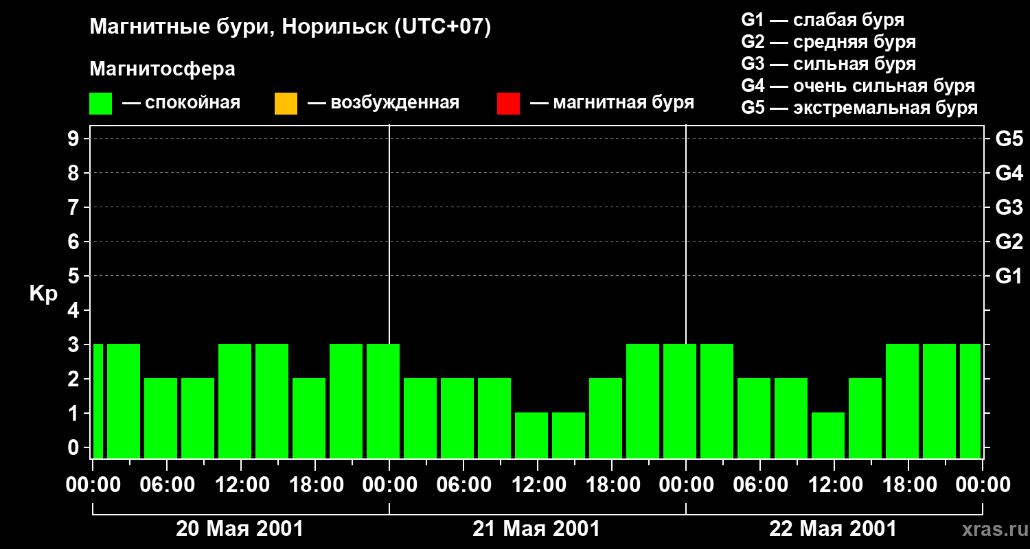 Изменения геомагнитного индекса Kp с 20 по 22 мая 2001 года для средних широт
