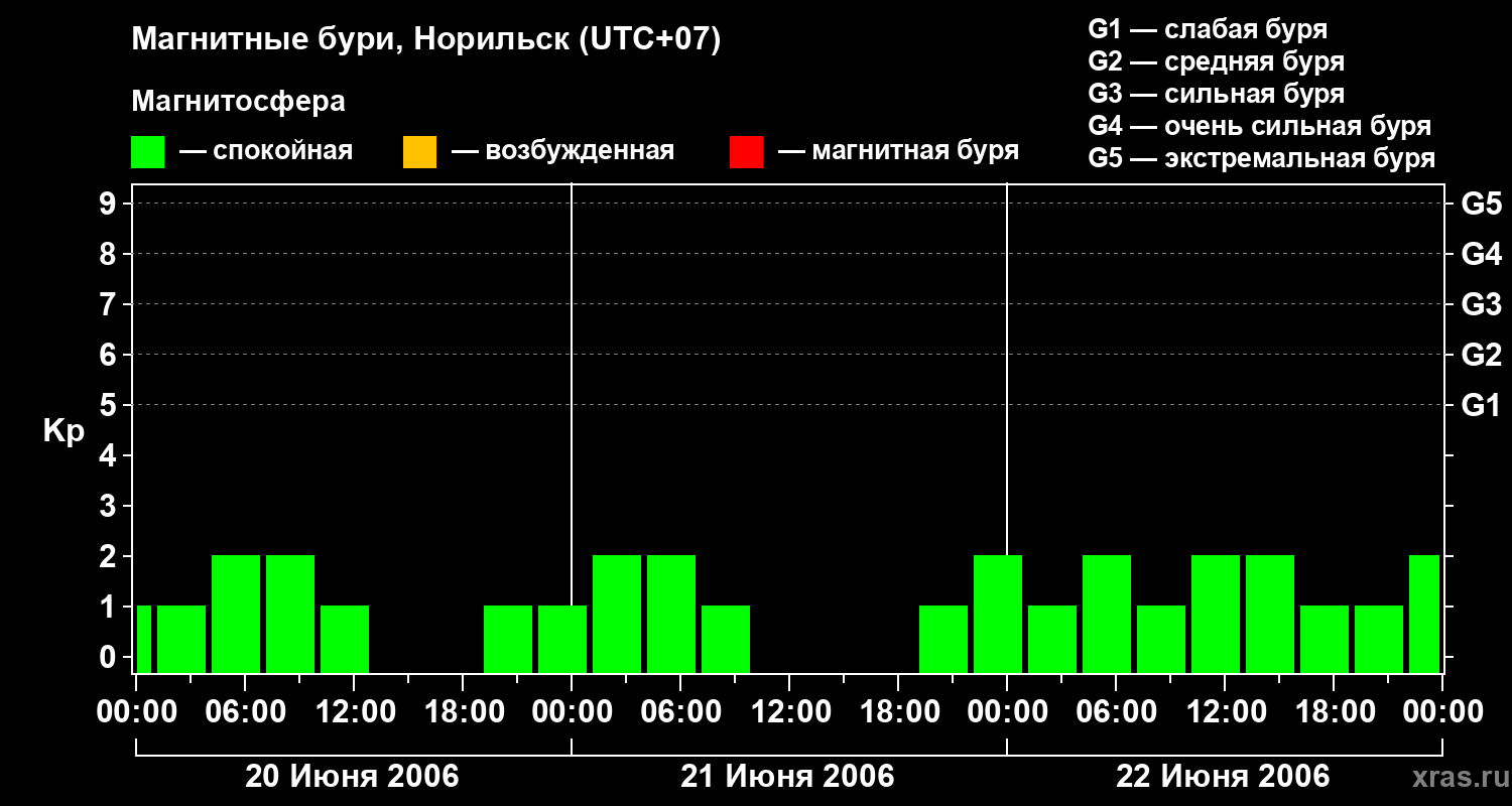 Изменения геомагнитного индекса Kp с 20 по 22 июня 2006 года для средних широт