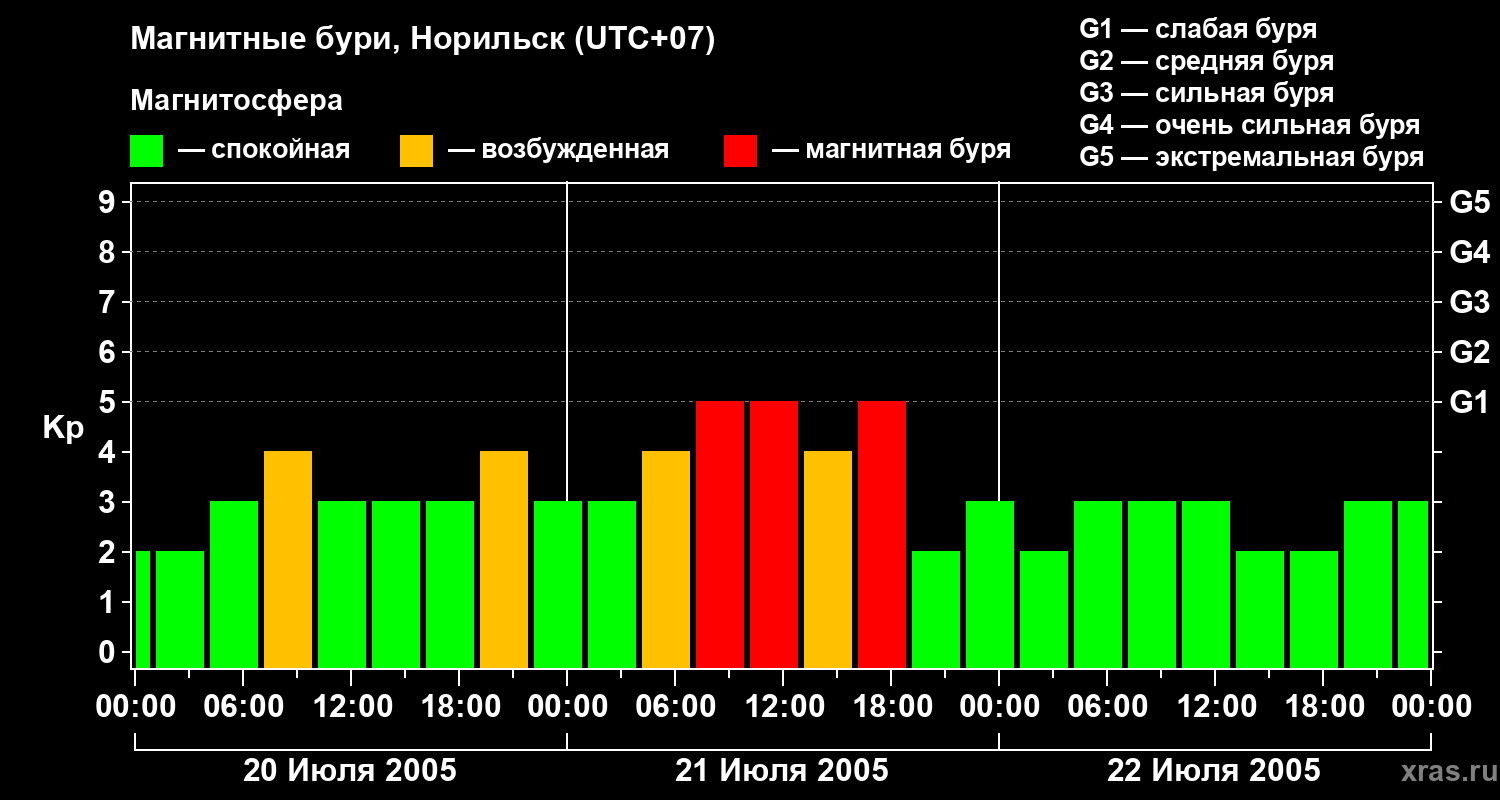 Изменения геомагнитного индекса Kp с 20 по 22 июля 2005 года для средних широт