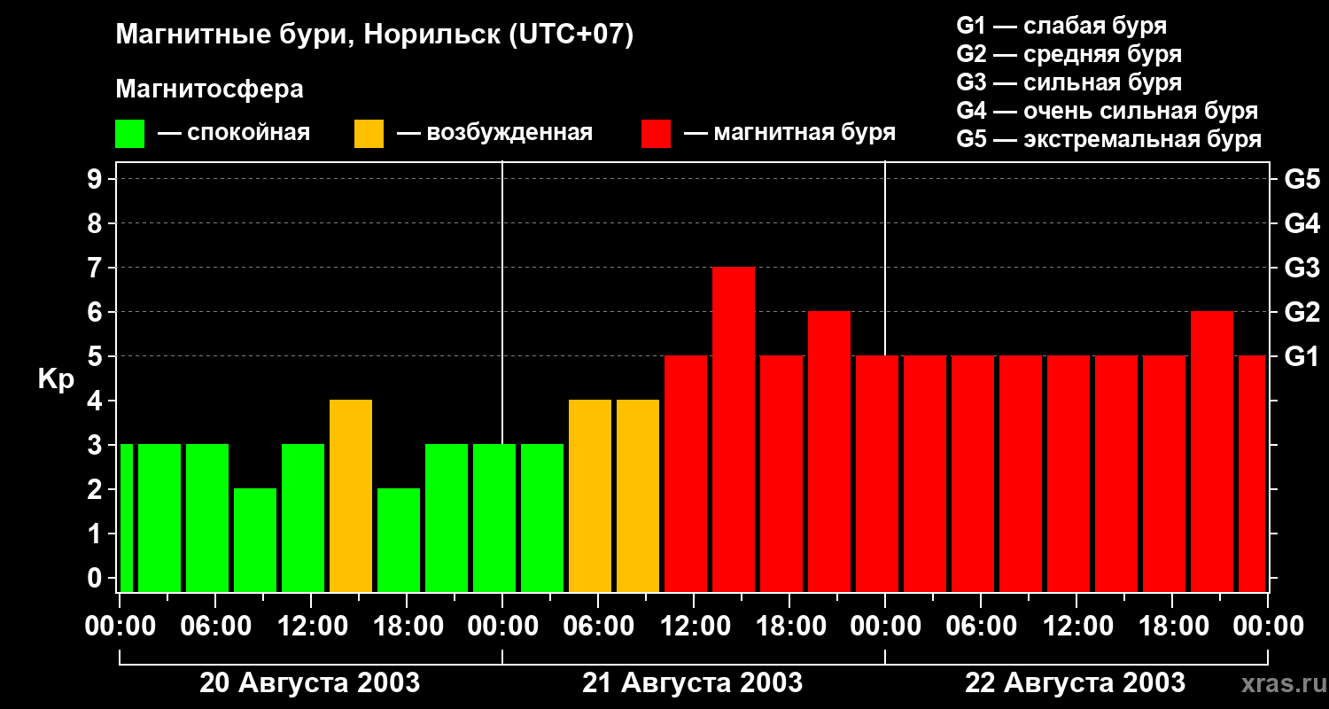 Изменения геомагнитного индекса Kp с 20 по 22 августа 2003 года для средних широт