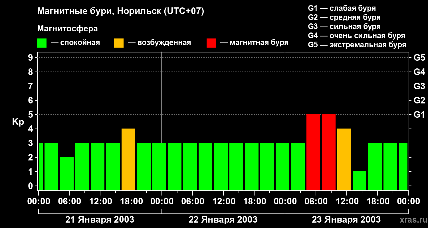 Изменения геомагнитного индекса Kp с 21 по 23 января 2003 года для средних широт