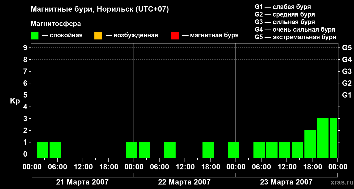 Изменения геомагнитного индекса Kp с 21 по 23 марта 2007 года для средних широт