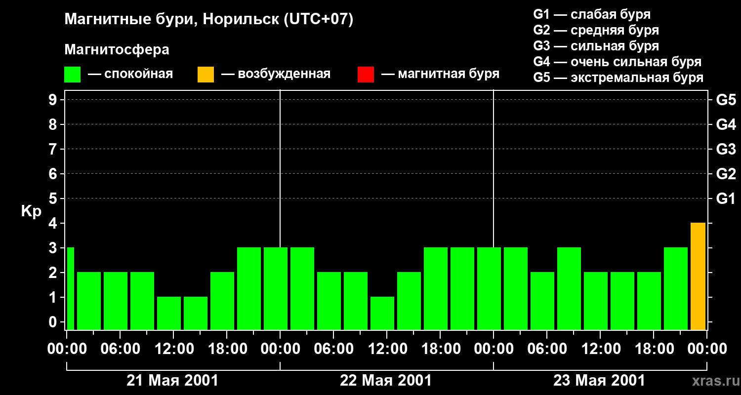 Изменения геомагнитного индекса Kp с 21 по 23 мая 2001 года для средних широт