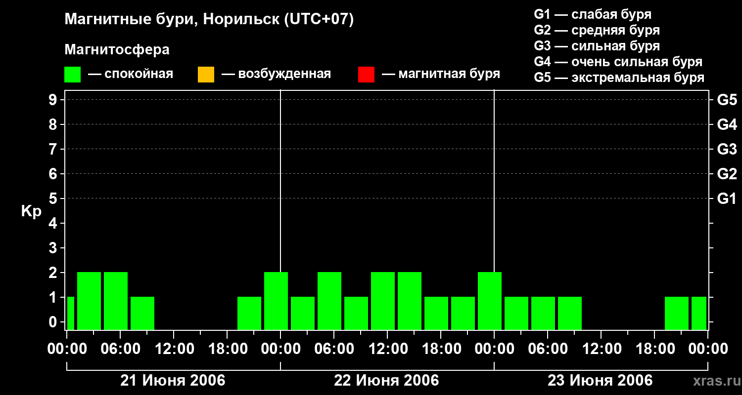 Изменения геомагнитного индекса Kp с 21 по 23 июня 2006 года для средних широт