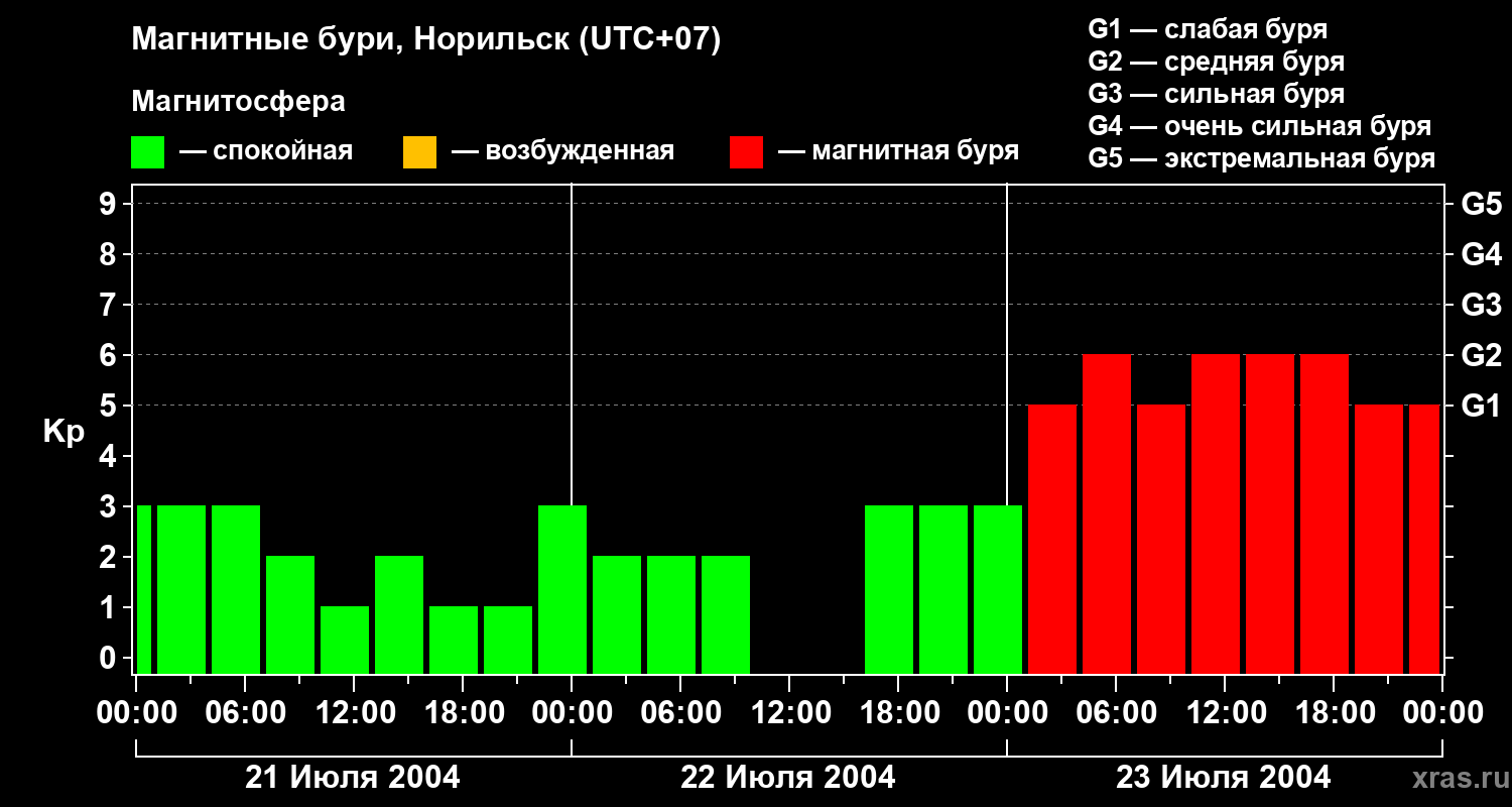 Изменения геомагнитного индекса Kp с 21 по 23 июля 2004 года для средних широт