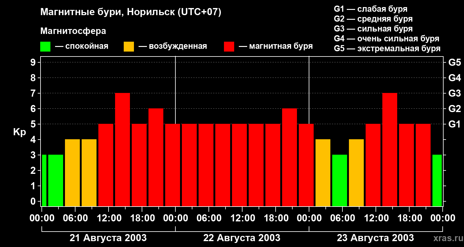 Изменения геомагнитного индекса Kp с 21 по 23 августа 2003 года для средних широт