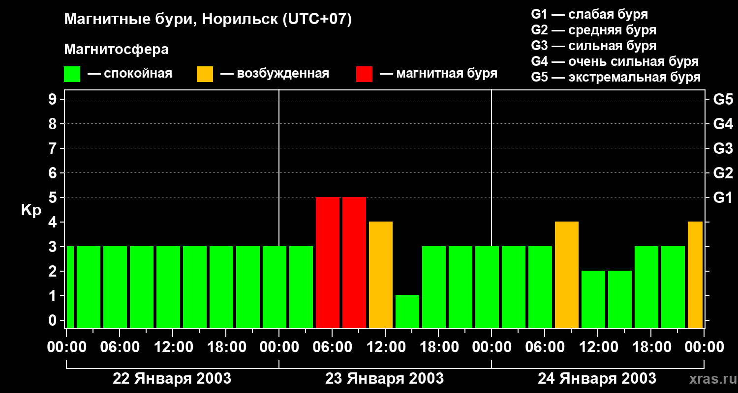 Изменения геомагнитного индекса Kp с 22 по 24 января 2003 года для средних широт