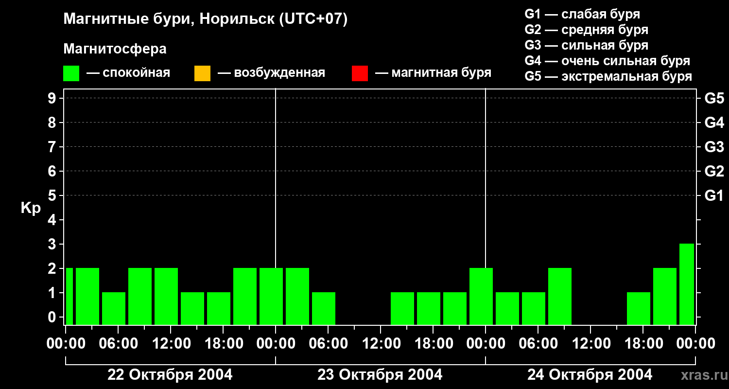 Изменения геомагнитного индекса Kp с 22 по 24 октября 2004 года для средних широт