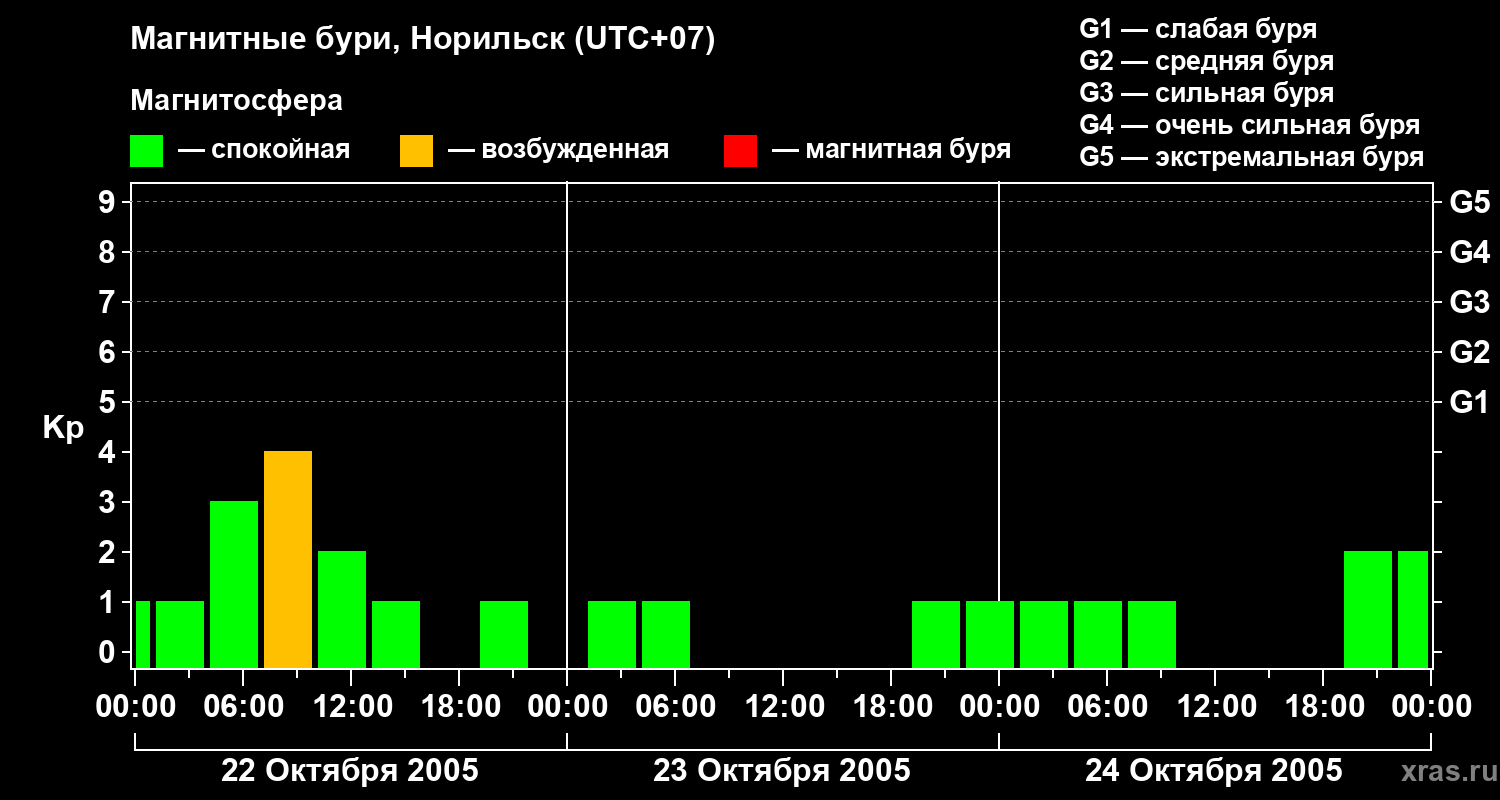 Изменения геомагнитного индекса Kp с 22 по 24 октября 2005 года для средних широт