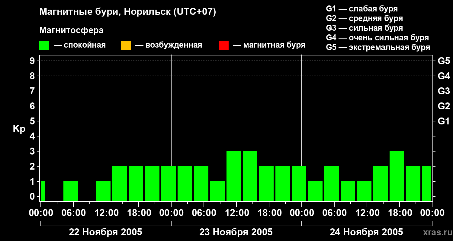 Изменения геомагнитного индекса Kp с 22 по 24 ноября 2005 года для средних широт