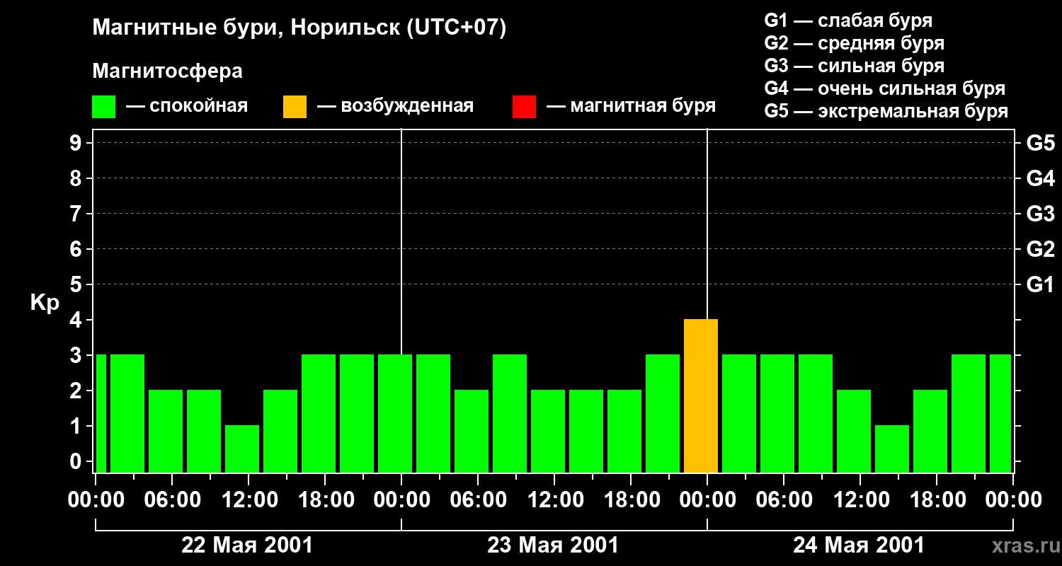 Изменения геомагнитного индекса Kp с 22 по 24 мая 2001 года для средних широт