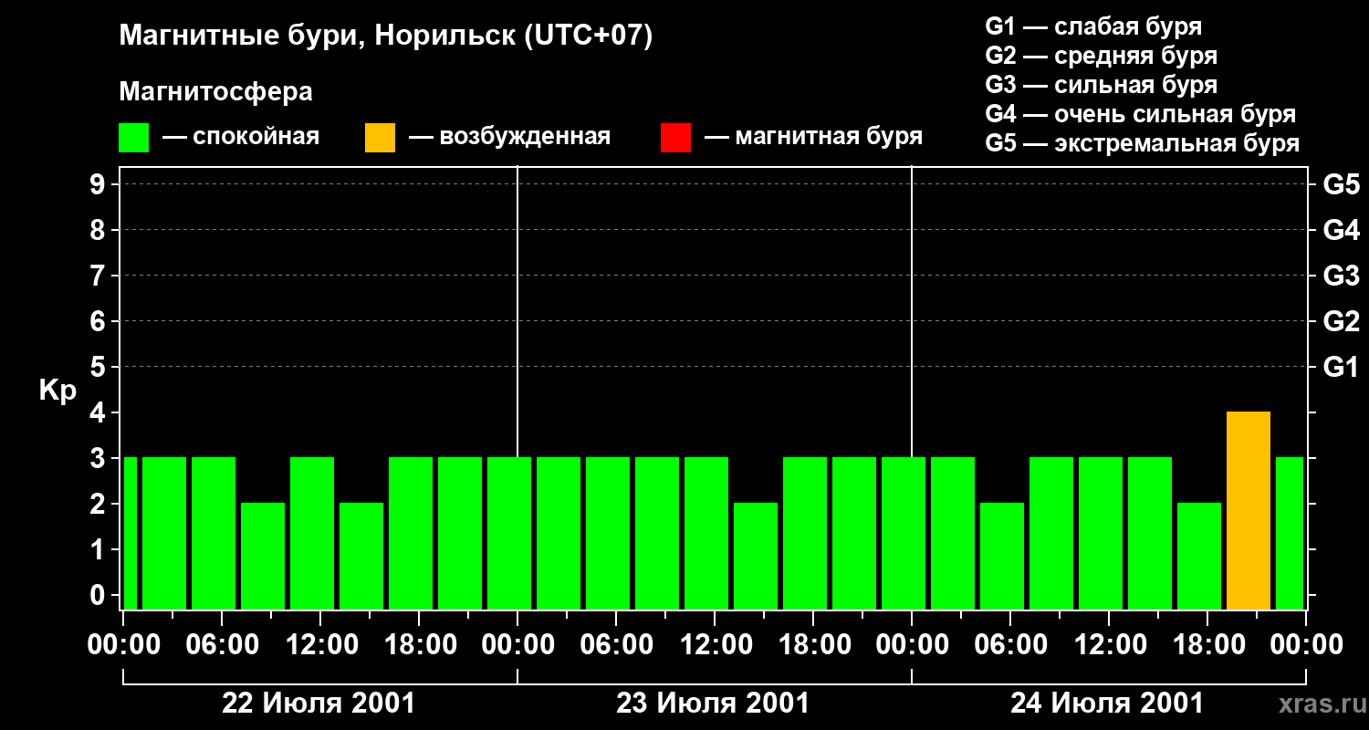 Изменения геомагнитного индекса Kp с 22 по 24 июля 2001 года для средних широт