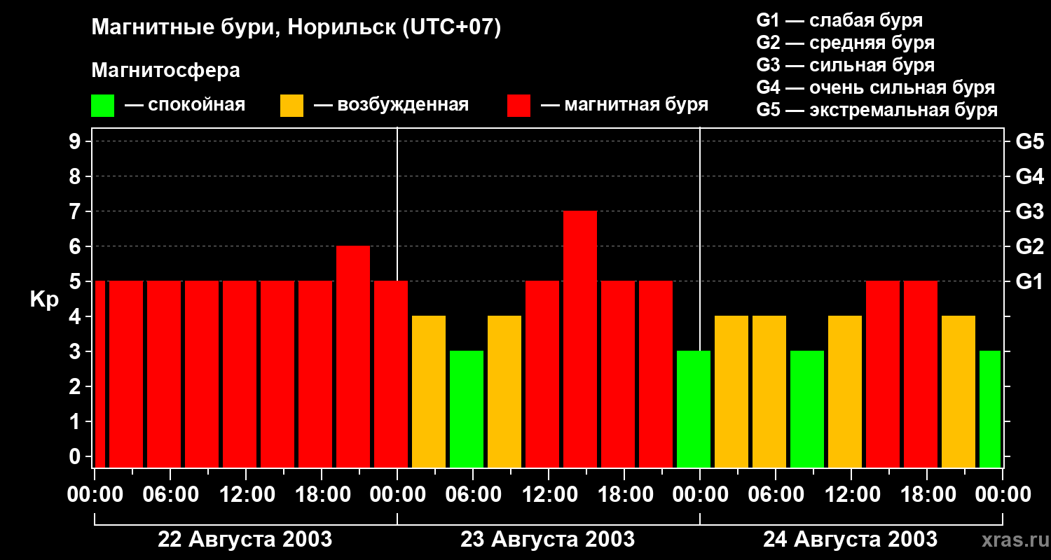 Изменения геомагнитного индекса Kp с 22 по 24 августа 2003 года для средних широт