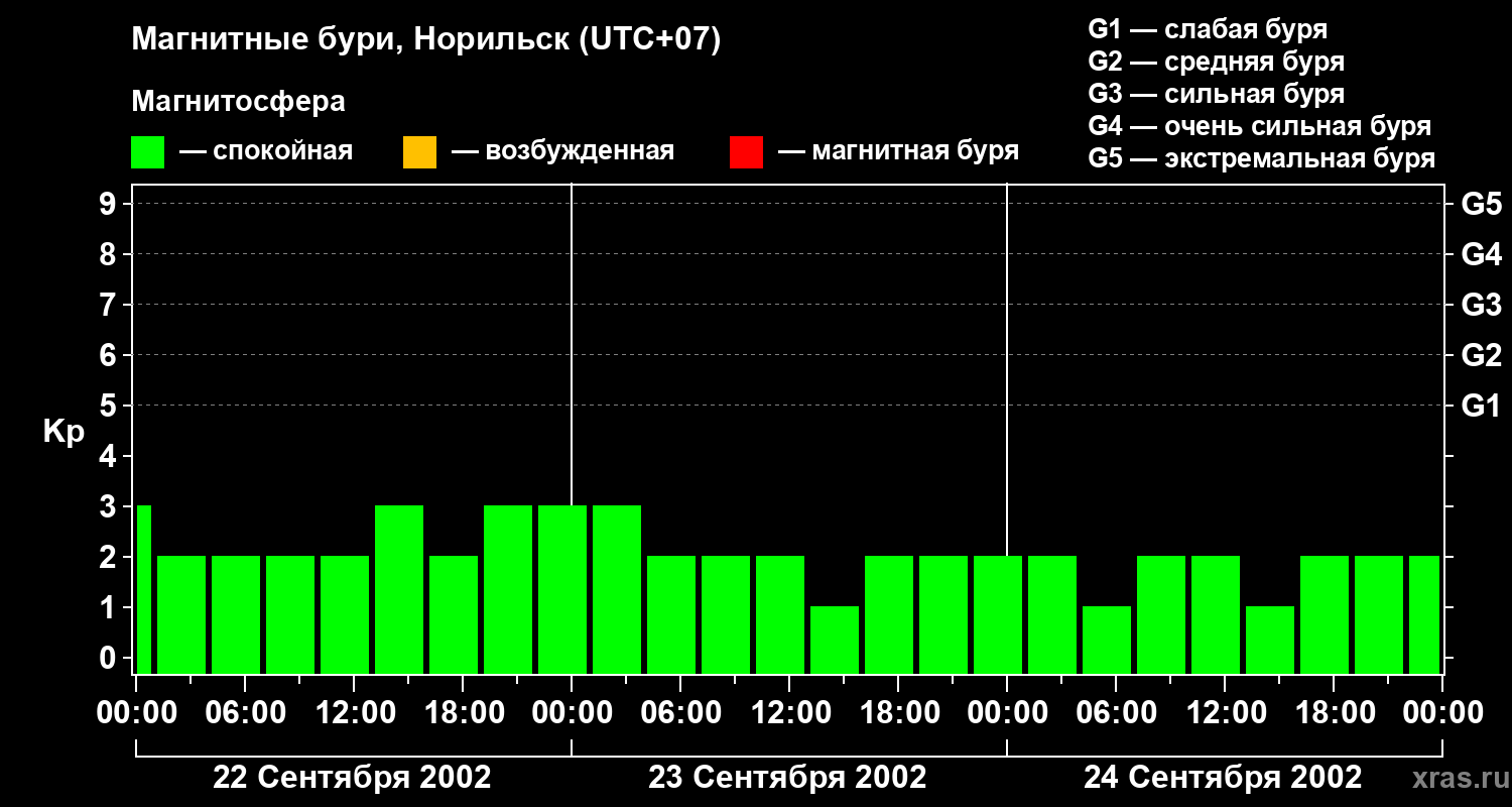 Изменения геомагнитного индекса Kp с 22 по 24 сентября 2002 года для средних широт