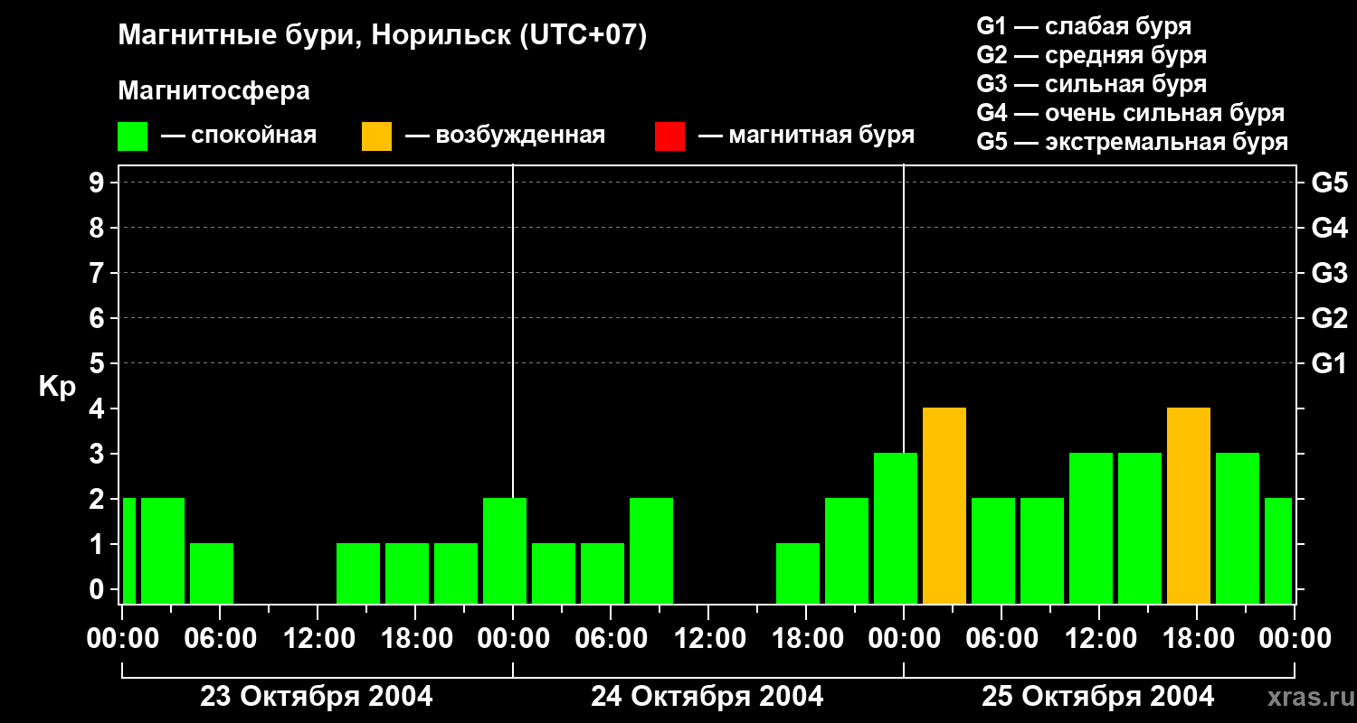 Изменения геомагнитного индекса Kp с 23 по 25 октября 2004 года для средних широт