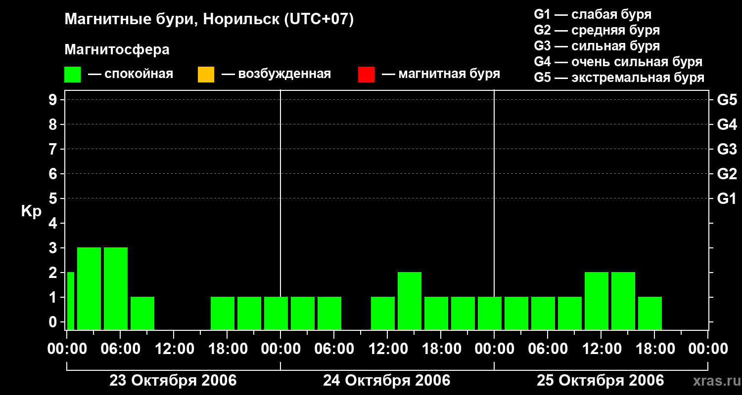 Изменения геомагнитного индекса Kp с 23 по 25 октября 2006 года для средних широт