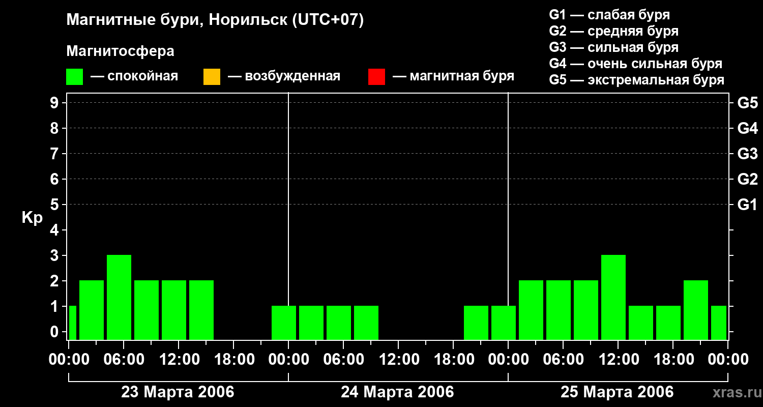 Изменения геомагнитного индекса Kp с 23 по 25 марта 2006 года для средних широт
