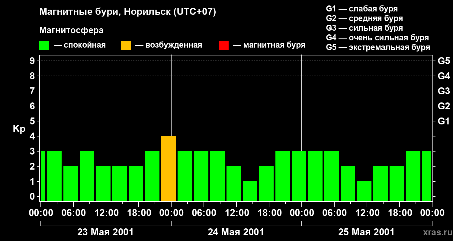 Изменения геомагнитного индекса Kp с 23 по 25 мая 2001 года для средних широт