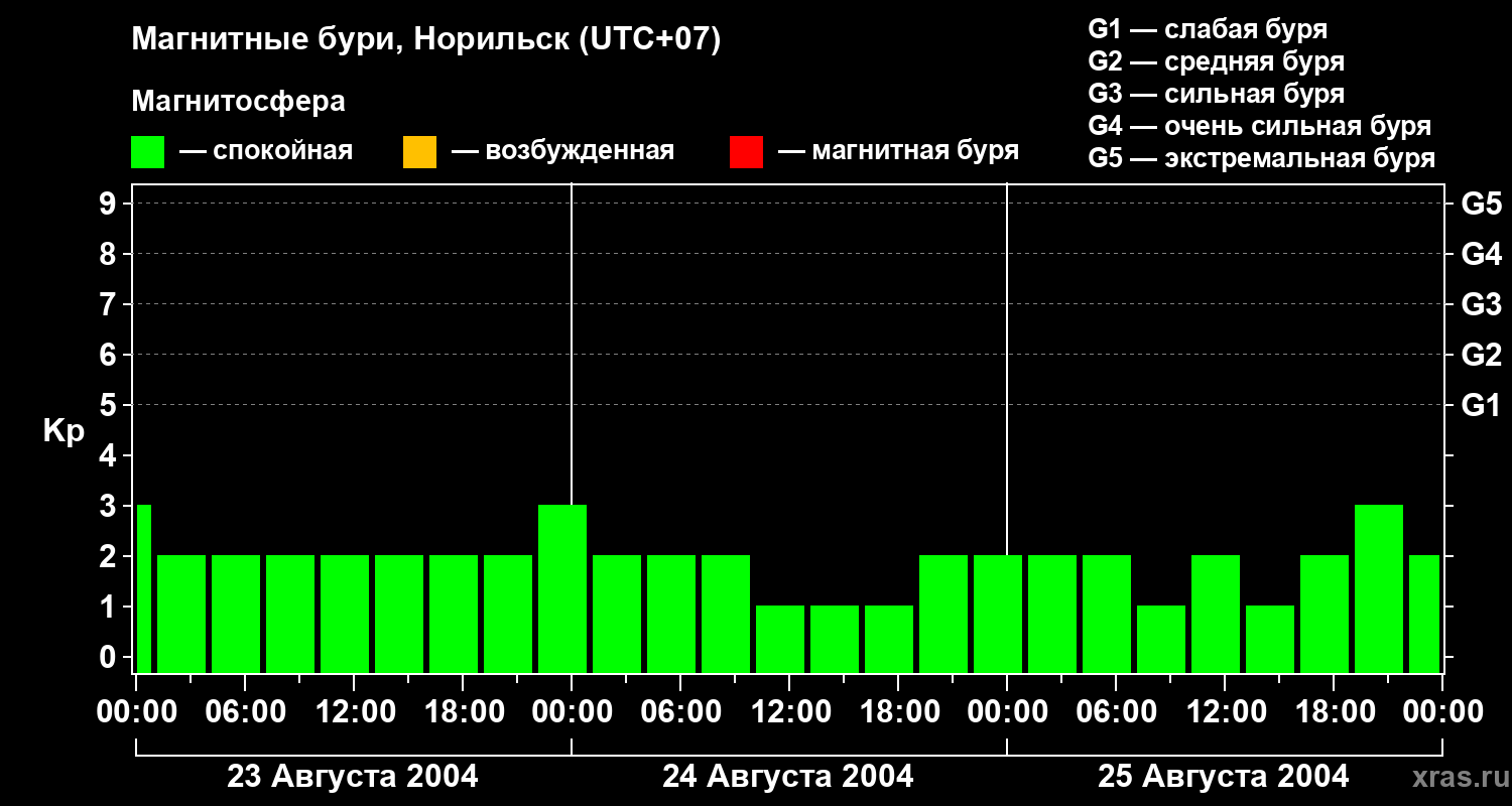Изменения геомагнитного индекса Kp с 23 по 25 августа 2004 года для средних широт