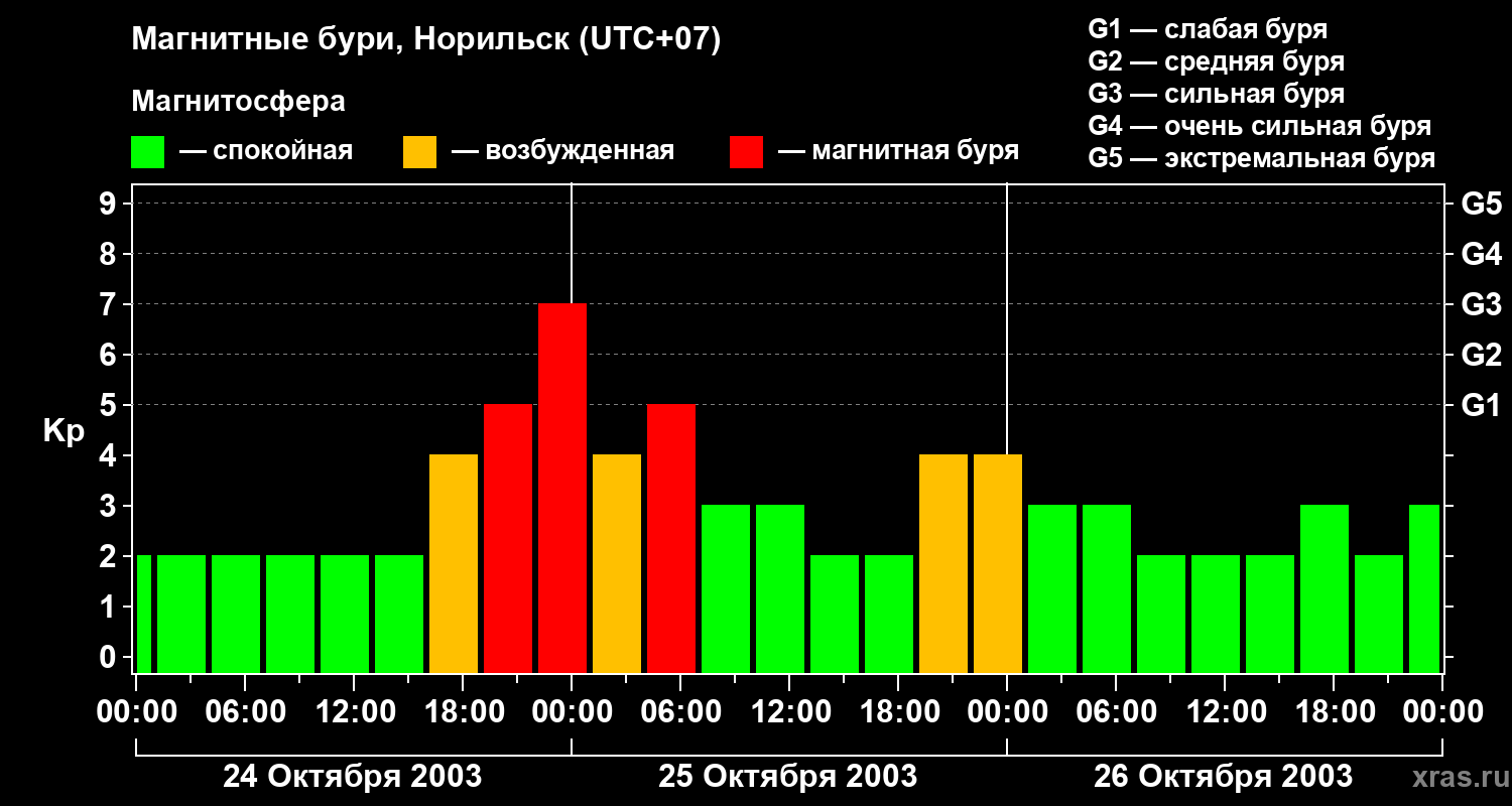 Изменения геомагнитного индекса Kp с 24 по 26 октября 2003 года для средних широт