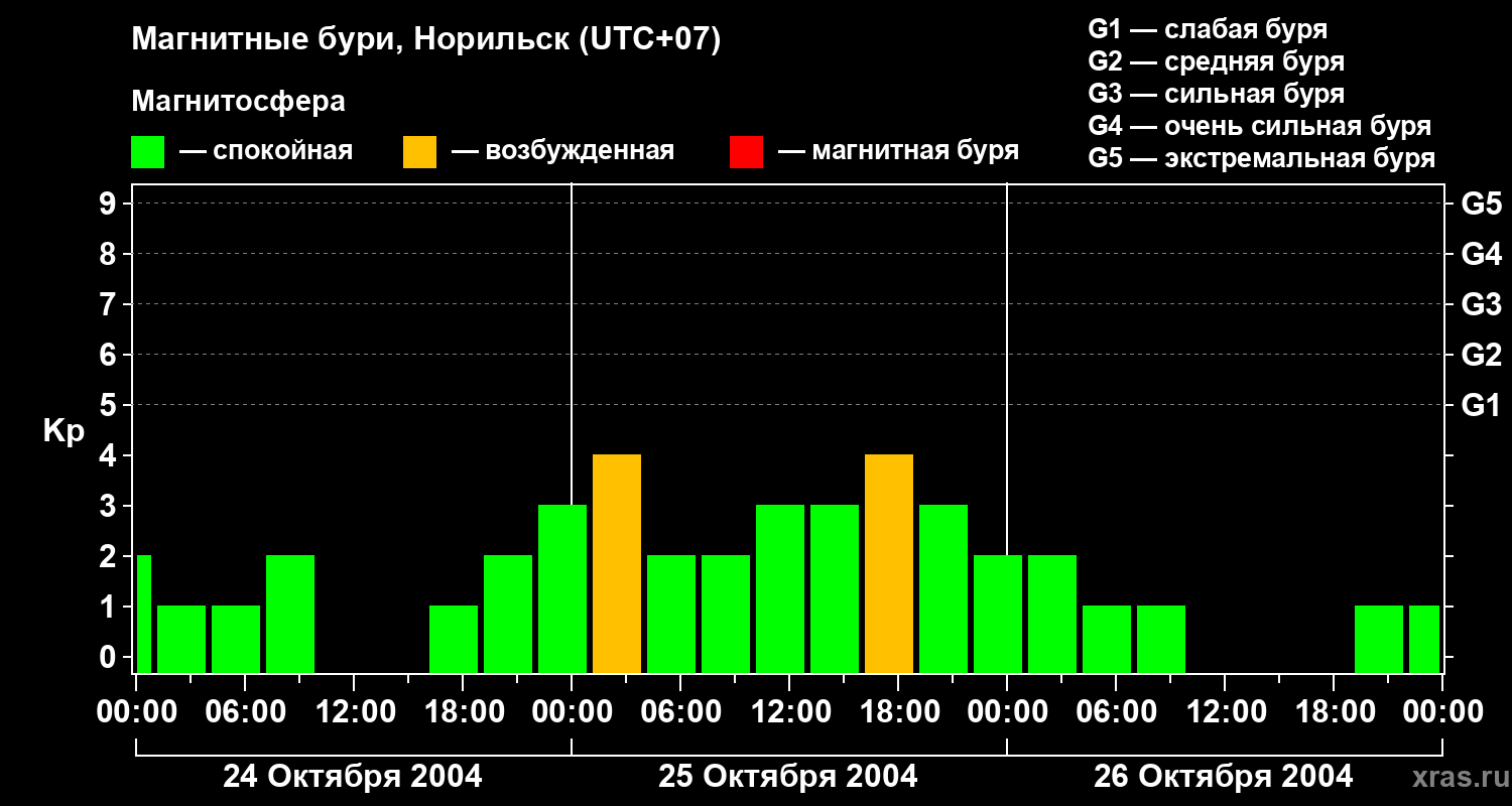 Изменения геомагнитного индекса Kp с 24 по 26 октября 2004 года для средних широт