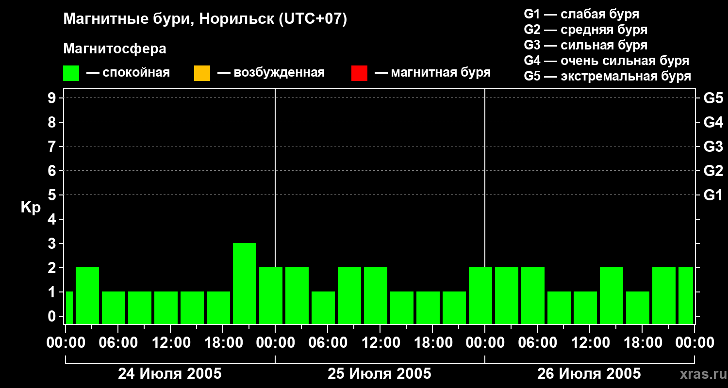 Изменения геомагнитного индекса Kp с 24 по 26 июля 2005 года для средних широт