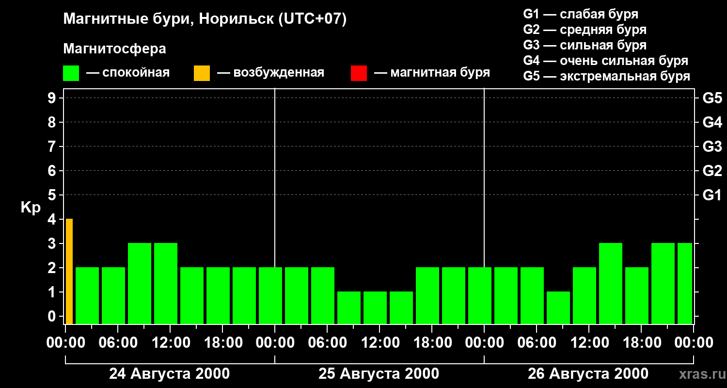 Изменения геомагнитного индекса Kp с 24 по 26 августа 2000 года для средних широт