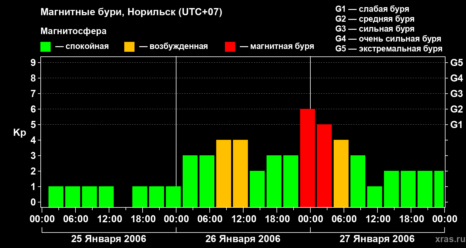 Изменения геомагнитного индекса Kp с 25 по 27 января 2006 года для средних широт