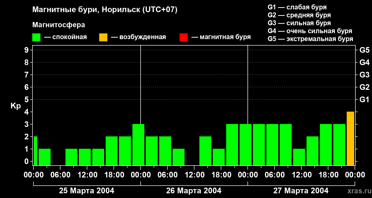 Изменения геомагнитного индекса Kp с 25 по 27 марта 2004 года для средних широт