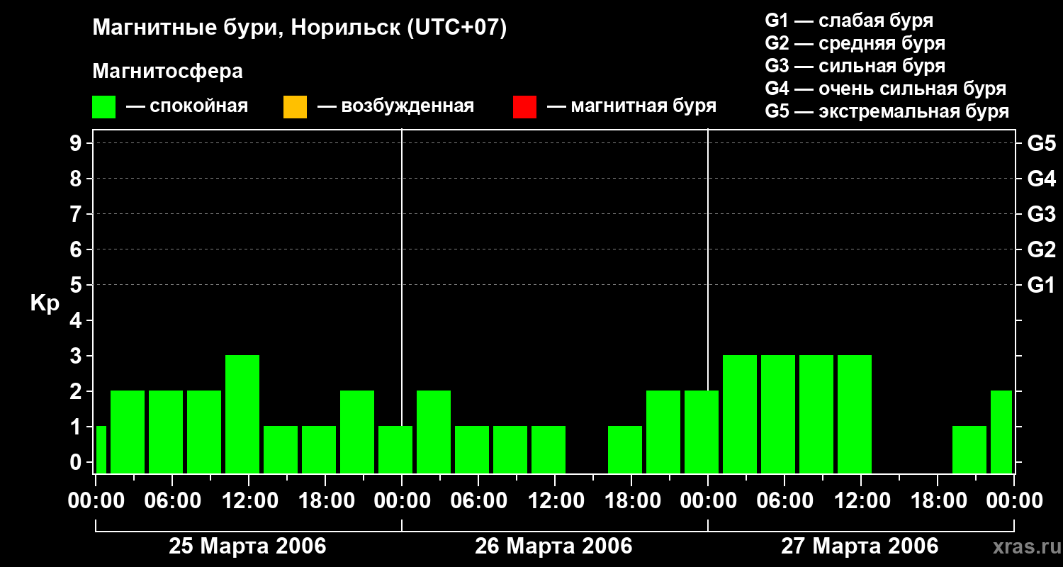 Изменения геомагнитного индекса Kp с 25 по 27 марта 2006 года для средних широт