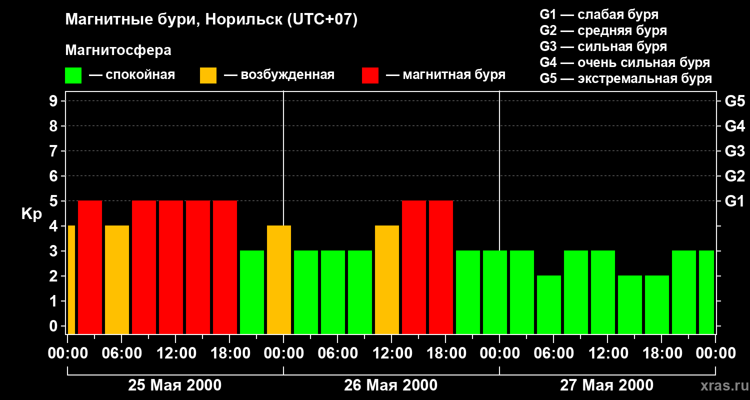 Изменения геомагнитного индекса Kp с 25 по 27 мая 2000 года для средних широт