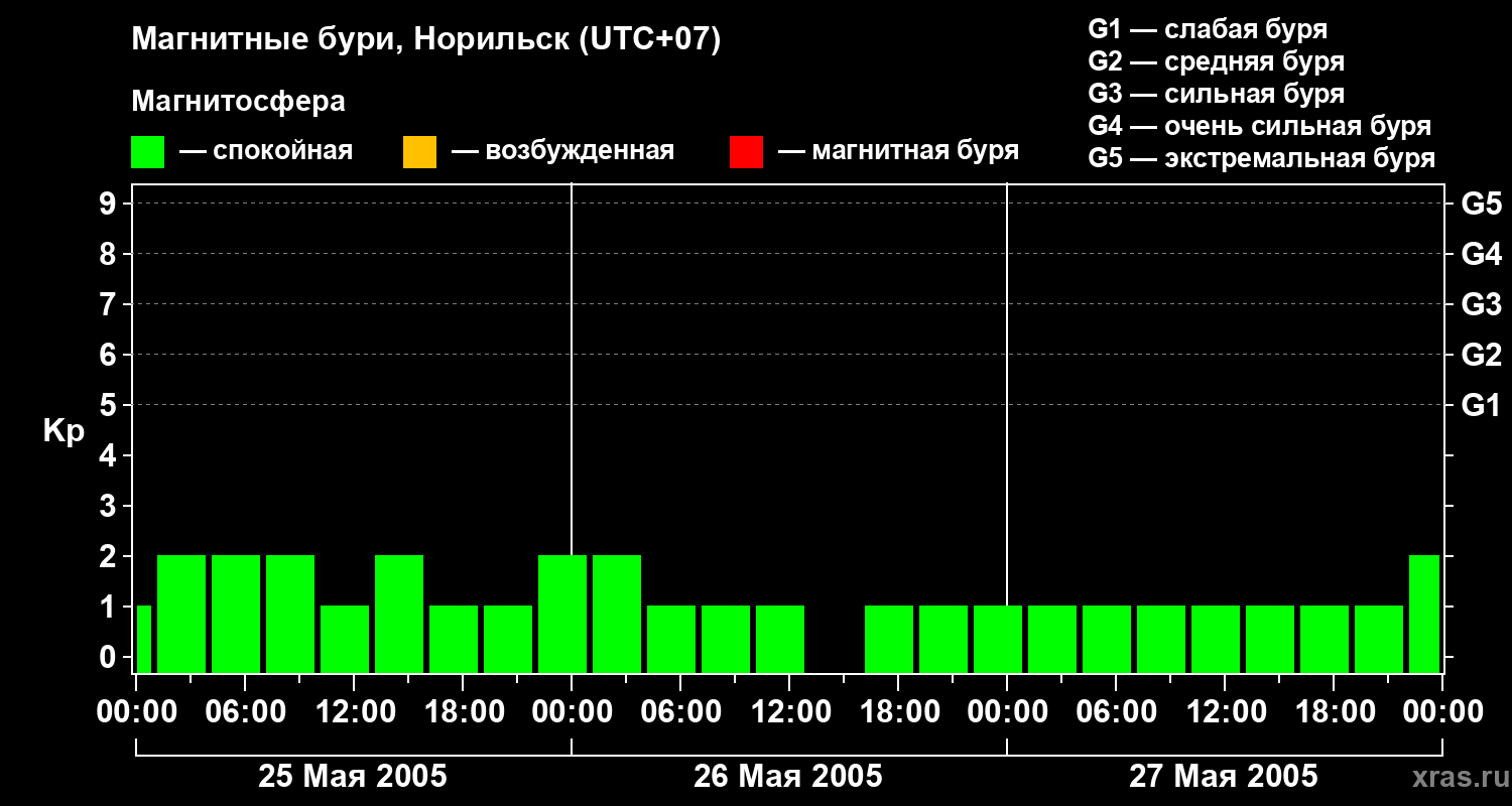 Изменения геомагнитного индекса Kp с 25 по 27 мая 2005 года для средних широт
