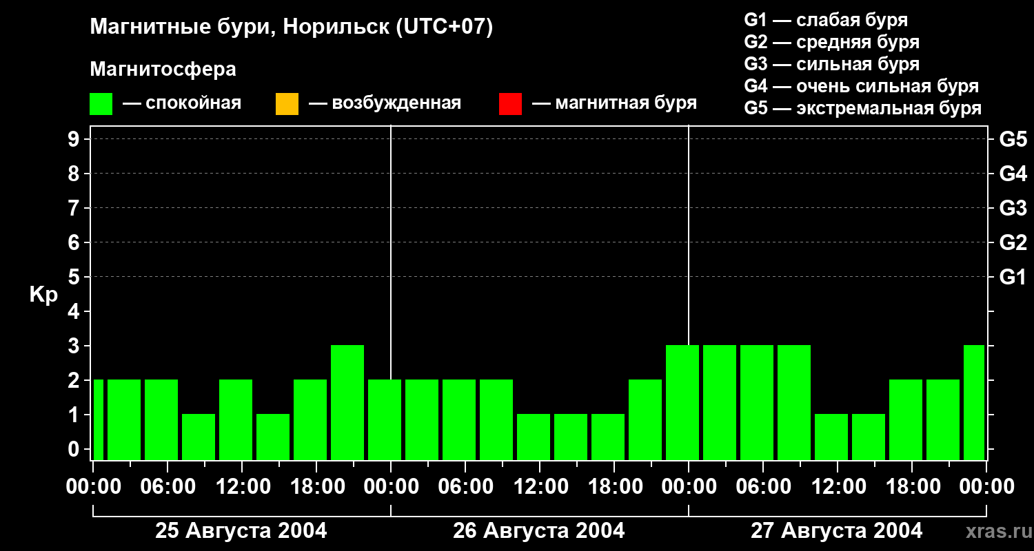 Изменения геомагнитного индекса Kp с 25 по 27 августа 2004 года для средних широт