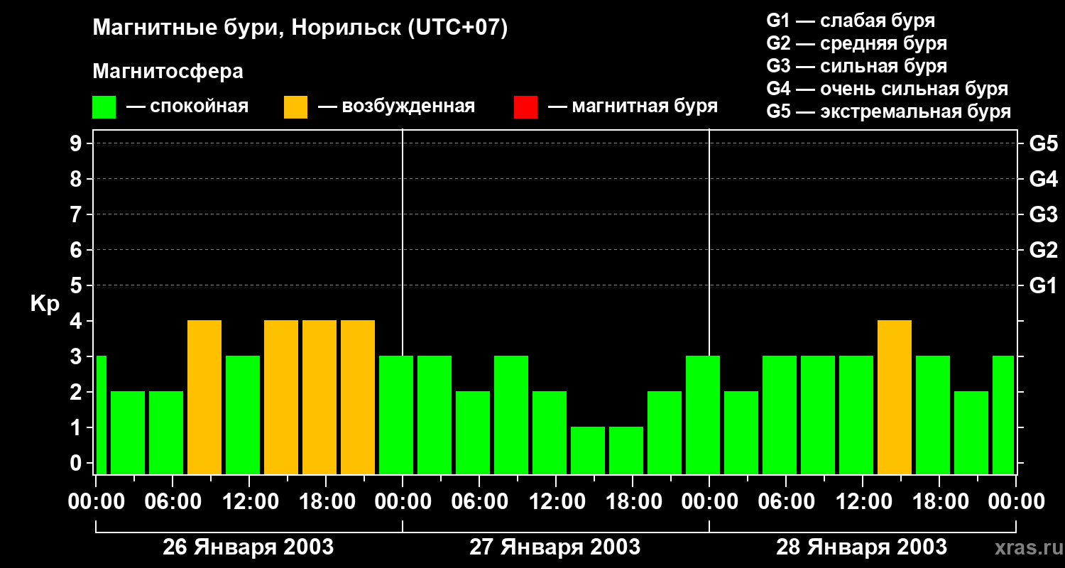 Изменения геомагнитного индекса Kp с 26 по 28 января 2003 года для средних широт