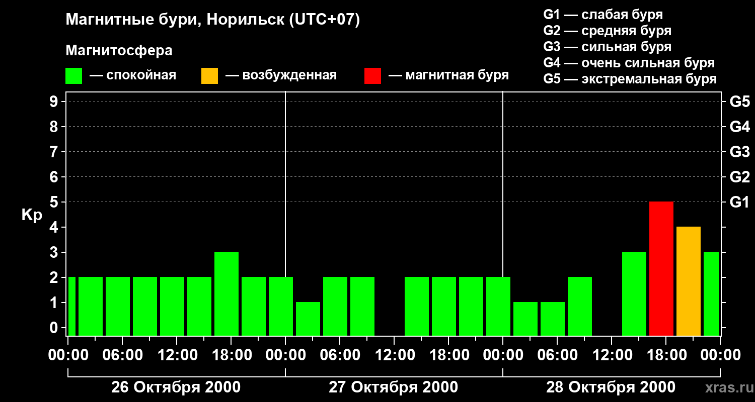Изменения геомагнитного индекса Kp с 26 по 28 октября 2000 года для средних широт