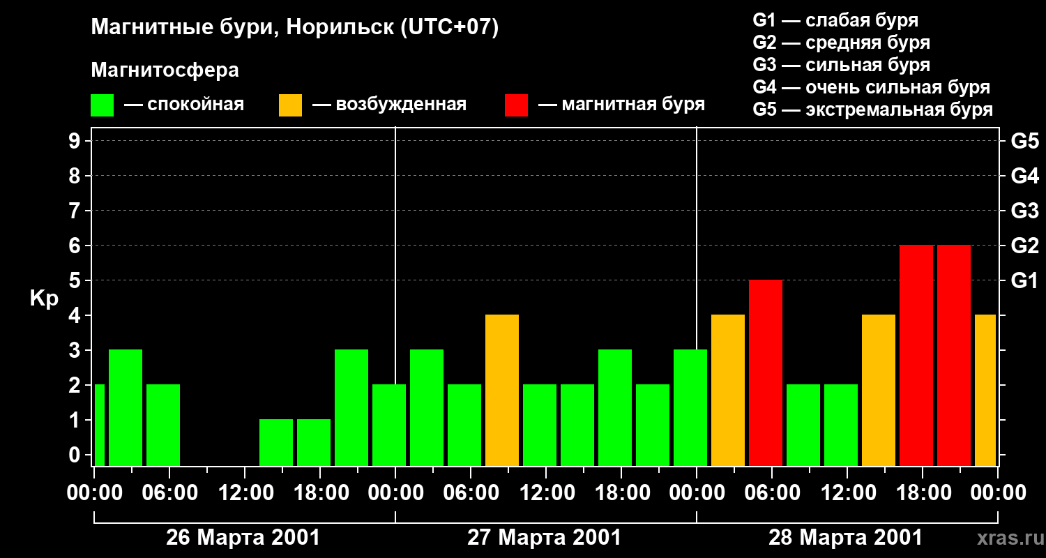 Изменения геомагнитного индекса Kp с 26 по 28 марта 2001 года для средних широт